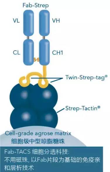 以Fab片段為基礎(chǔ)的無痕親和細胞分選技術(shù)(traceless affinity cell selection, Fab-TACS),由IBA Lifesciences根據(jù)其獨家的Strep-tag?/Strep-Tactin?蛋白純化系統(tǒng)發(fā)展而來。Fab-TACS運用免疫親和層析的原理,利用細胞表面抗原分子CD marker與Fab片段的特異性結(jié)合來進行捕捉及釋放目標細胞。以不具磁性且可逆的試劑,取代一般具高親和力的完整抗體, 直接由全血或其他血液樣本來進行溫和的標準化分選,因此能精準的提供您不含標記、未被活化的目標細胞。