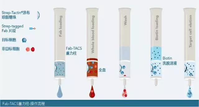 Fab-TACS重力柱內(nèi)裝有經(jīng)Strep-Tactin?涂布的細胞級中型瓊脂糖珠(cell-grade agarose matrix),如此一來,含有Twin-Strep-tag?的Fab片段(Fab-Streps)能與瓊脂糖珠結(jié)合。將全血或血液樣本加入重力柱,此時目標細胞會與Fab-Streps進行特異性結(jié)合,非目標細胞則會直接流出。隨后,清洗重力柱將多余的非目標細胞或血液雜質(zhì)洗去。最后,加入生物素(biotin)中斷Fab-Streps與Strep-Tactin?間的結(jié)合,與此同時,低親和力的Fab-Streps也會從目標細胞上解離,而您便能獲得不含標記、幾近原始的目標細胞來進行后續(xù)的實驗。