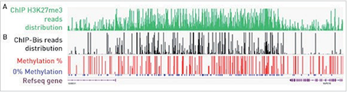 圖3 A: 使用Diagenode的iDeal ChIP-seq Kit對(duì)人細(xì)胞系Gm12878 H3K27me3標(biāo)記的組蛋白進(jìn)行染色質(zhì)免疫沉淀;B: 使用Premium WGBS Kit對(duì)ChIP’d DNA進(jìn)一步處理并測序。