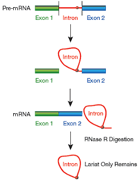 隨著環(huán)狀RNA的深入研究,環(huán)狀RNA制備問題就越來越備受關注。Lucigen提供大腸桿菌來源的RNase R,是一種Mg依賴性的3’ →5’核糖核酸外切酶,能消化基本上所有線性RNA,但不消化套索或環(huán)狀RNA的結構,或者3’突出短于7個核苷酸的雙鏈RNA。即是除了tRNA,5S RNA和內(nèi)含子套索結構外,大多數(shù)細胞RNA都將被RNase R完全消化。如圖4,RNase R可從總RNA中分離出內(nèi)含子前體mRNA剪切產(chǎn)生的套索RNA。以這種方法獲得的RNA作為模板來生產(chǎn)標記的cDNA,可作為含有潛在的內(nèi)含子序列的微陣列的目標,或者用于包含完整的染色體或者基因組的重疊區(qū)域平鋪陣列。產(chǎn)生的cDNA不代表線性內(nèi)含子,但其含有的序列是來源于內(nèi)含子的。
