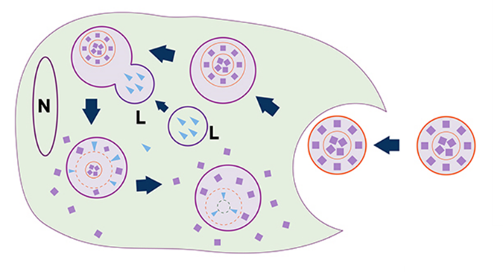 圖. Clophosome?巨噬細胞耗竭的原理。包裹著氯磷酸的脂質體Clophosome?借助巨噬細胞的內吞作用進入細胞,與溶酶體融合后,在磷酸酶的作用下,釋放出氯磷酸,當細胞內的氯磷酸濃度達到一定閾值,就會對巨噬細胞造成不可逆轉的損害,從而迫使其進入細胞凋亡程序。