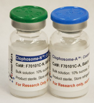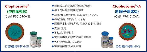 體內巨噬細胞耗竭(in vivo macrophage depletion)是巨噬細胞功能研究的重要方法之一。FormuMax公司推出的Clophosome?系列產品就是將膜不通透性的氯磷酸鹽—氯磷酸二鈉(clodronate)包裹于脂質體內并帶入細胞,利用巨噬細胞的內吞機制實現(xiàn)巨噬細胞的耗竭。