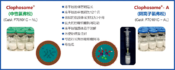 為了延長脂質體的保質期,廠家已成功推出凍干粉狀的Clophosome?產品,其質保期已延長至12個月。通過簡單的溶解,即可成功獲得氯磷酸鹽脂質體。同樣,凍干粉狀的Clophosome?保持了與液態(tài)Clophosome?同樣杰出的巨噬細胞耗竭功能,以及活性高,使用方便,無菌無毒,以及高濃度,高包封率,不粘稠,無沉淀,易于注射等諸多優(yōu)越性能,尤其是凍干粉狀的Clophosome?克服了脂質體保質期短,穩(wěn)定性差的缺陷。