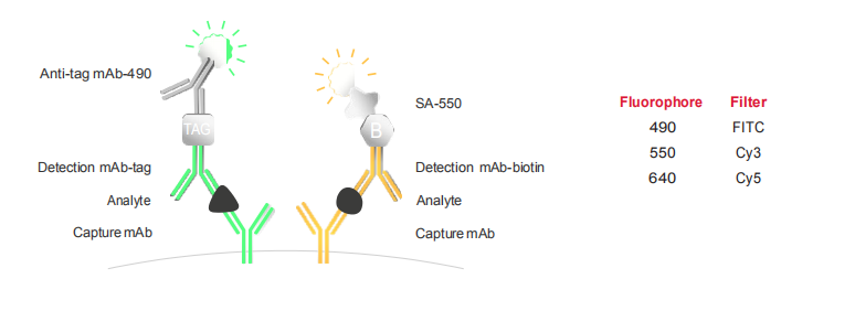 FluoroSpot能夠分析抗原特異性的多功能T細(xì)胞,例如,IFN-γ和IL-2的分析。三明治夾心結(jié)構(gòu)在熒光斑點中得以應(yīng)用,不同特異性的單克隆捕獲抗體混合物被包被于96孔板的PVDF膜上,生物素標(biāo)記的檢測抗體識別一種分泌物,tag標(biāo)記的檢測抗體識別其它的分泌物來實現(xiàn)雙色或三色細(xì)胞因子分泌細(xì)胞的檢測。檢測通過帶有特定熒光基團的共軛試劑放大信號斑點,可用自動讀板器進(jìn)行分析。