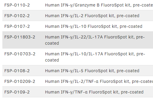 通過分泌單,雙和三色細(xì)胞因子分析劃分功能性T細(xì)胞亞群在許多不同的研究領(lǐng)域均引起極大的興趣。FluoroSpot可用于疫苗開發(fā),主要用于檢測和分析疫苗特異性免疫應(yīng)答。在癌癥研究中,F(xiàn)luoroSpot可用于,例如監(jiān)測腫瘤浸潤淋巴細(xì)胞或通過同時分析IFN-γ和顆粒酶B的分泌,以提供細(xì)胞毒性T細(xì)胞反應(yīng)更直接的評估。Mabtech公司提供了各種不同的熒光斑點試劑盒用于單,雙和三色分析物的T細(xì)胞的分析,其中IFN-γ可單獨分析或與幾個不同的分析物同時進(jìn)行分析。