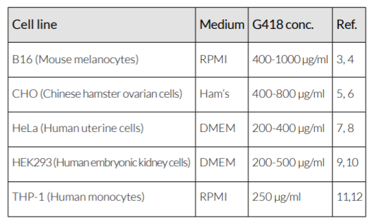 InvivoGen建議的工作濃度:G418通常以400 μg/ ml的濃度使用。當(dāng)然仍需要為您的細(xì)胞確定最佳濃度。下面列出了常見(jiàn)哺乳動(dòng)物細(xì)胞使用G418篩選的濃度(參見(jiàn)下表)。