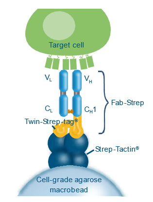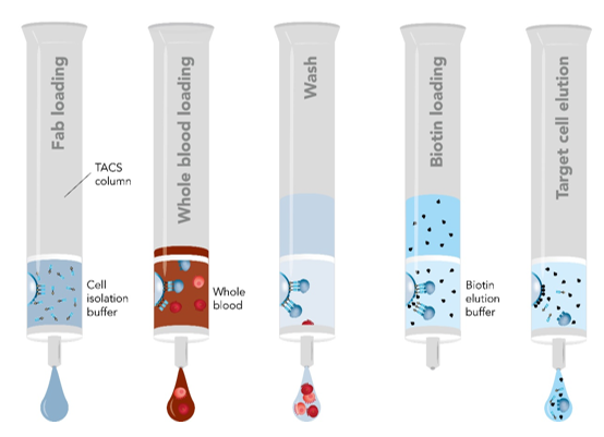 Fab-TACS柱子填充了包被有Strep-Tactin多聚體的細(xì)胞級瓊脂糖基質(zhì),偶聯(lián)上Strep-tagFab片段(Fab-Streps)特異性的結(jié)合到瓊脂糖基質(zhì)上。隨后,加入全血或其他血液制劑流過柱子。目的細(xì)胞通過特異性的與Fab-Streps作用從而結(jié)合到瓊脂糖基質(zhì)上,其他非目的細(xì)胞則有效的被洗去。最后,加入生物素使目的細(xì)胞從Fab-Streps上解離。至此,就已分離得到不帶任何標(biāo)記的、真實(shí)的目的細(xì)胞可用于下游的實(shí)驗(yàn)研究。