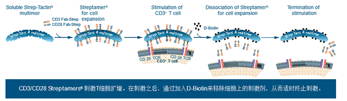Streptamers?應(yīng)用于T細(xì)胞擴(kuò)增是目前T細(xì)胞擴(kuò)增術(shù)中一項(xiàng)較新穎的技術(shù)。該技術(shù)的核心在于:將抗CD3和抗CD28Fab-Streps結(jié)合到Strep-Tactin多聚體上,使它們形成可溶性的蛋白復(fù)合物。在刺激之后,通過加入D-Biotin來移除細(xì)胞上的刺激劑,從而適時(shí)終止刺激。