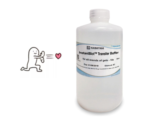 當(dāng)然蛋白電泳只是WB實(shí)驗(yàn)的第一步,那還有什么方法能加快后續(xù)實(shí)驗(yàn)(如轉(zhuǎn)膜)進(jìn)程呢?別急,今天就給大家介紹一款來自分子產(chǎn)品專家Expedeon公司的快速轉(zhuǎn)膜液——InstantBlot?Transfer Buffer(貨號:NXB87500),作為Expedeon的一款專利產(chǎn)品,該轉(zhuǎn)膜液能夠大幅提升蛋白從“膠”至“膜”的轉(zhuǎn)移速度,最快只需10 min即可完成轉(zhuǎn)膜,并且不會產(chǎn)生過多的熱量,避免影響蛋白的后續(xù)檢測。