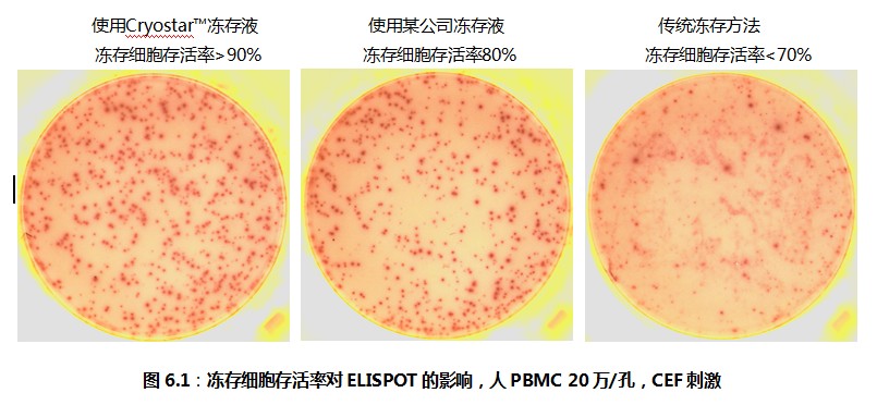 考慮到ELISPOT檢測(cè)的特殊性,荷蘭U-CyTech公司經(jīng)過(guò)精心的研究與反復(fù)的驗(yàn)證,推出了Cryostar?凍存試劑盒,在凍存液中添加了一系列對(duì)細(xì)胞有特殊保護(hù)作用的保護(hù)劑。達(dá)科為公司在接到Cryostar?凍存試劑盒之后,在我們的實(shí)驗(yàn)室以及國(guó)內(nèi)數(shù)家客戶的實(shí)驗(yàn)室做了細(xì)胞凍存與復(fù)蘇的實(shí)驗(yàn),并且對(duì)復(fù)蘇之后的細(xì)胞做了ELISPOT檢測(cè)。結(jié)果表明,淋巴細(xì)胞的存活率超過(guò)90%,ELISPOT斑點(diǎn)形成頻率與新鮮細(xì)胞完全相同。參見(jiàn)圖6.1。