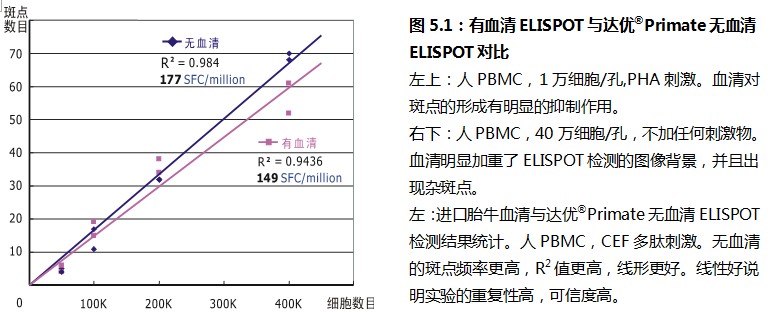 達科為公司做了一系列的有、無血清ELISPOT檢測對比試驗,并且在推廣ELISPOT技術的標準化以及建立ELISPOT檢測的質(zhì)控系統(tǒng)時,都采用了無血清ELISPOT檢測技術。在所有的實驗中達優(yōu)?都取得了優(yōu)于血清的結果??偨Y起來就是:背景更干凈,信噪比更高,頻率更穩(wěn)定,結果更真實。下圖5.1是一些實際案例。