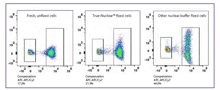 主要表現(xiàn)在固定劑對(duì)串聯(lián)染料(tandem-dye,如APC/Cy7、PE/Cy7等)的影響:一個(gè)是固定劑有可能造成串聯(lián)染料的斷裂,比如APC-Cy7和4%多聚甲醛溶液接觸時(shí)間超過4個(gè)小時(shí)染料就有可能斷裂,所以如果細(xì)胞直接重懸在固定液里面建議盡快上機(jī),如果要放到第二天上機(jī),需離心去除固定液后重懸在流式染色液或者是PBS里面,當(dāng)然有一些新的串聯(lián)熒光素可以有效減少這種情況,比如BioLegend的APC/Fire750TM染料。