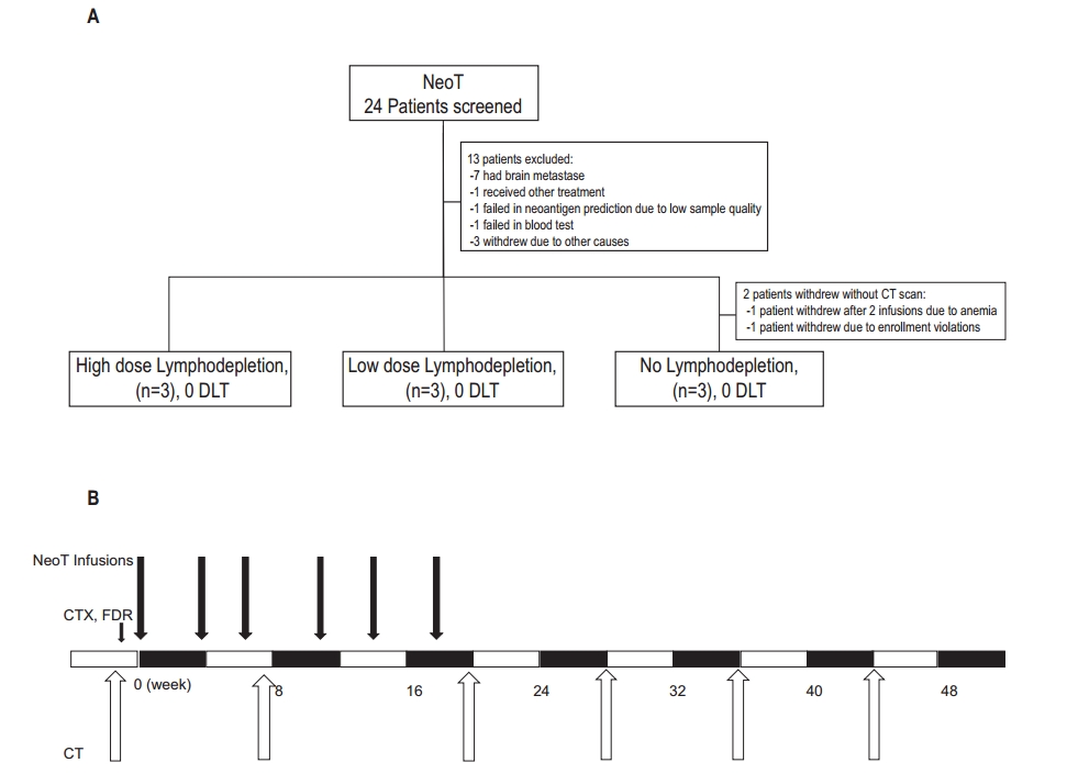 針對(duì)這些問(wèn)題,中山大學(xué)徐瑞華團(tuán)隊(duì)在2023年6月10日發(fā)表了題為“A pilot study of lymphodepletion intensity for peripheral blood mononuclear cell-derived neoantigen-specific CD8+ T cell therapy in patients with advanced solid tumors”的研究論文。該研究開發(fā)了一種從癌癥患者的外周血單個(gè)核細(xì)胞(PBMCs)中產(chǎn)生個(gè)性化Neo-T(新抗原特異性CD8+ T細(xì)胞)的方法。作者建立了一個(gè)流程,包括通過(guò)生物信息學(xué)分析預(yù)測(cè)新抗原,并在25天內(nèi)大規(guī)模擴(kuò)增新抗原特異性T細(xì)胞。為了評(píng)估Neo-T治療的臨床療效并確定Neo-T治療的最佳淋巴細(xì)胞耗竭強(qiáng)度,作者進(jìn)行了一項(xiàng)首次在人體中使用氟達(dá)拉濱和環(huán)磷酰胺增加劑量的Neo-T治療的研究。該研究是一項(xiàng)開放標(biāo)簽I期臨床試驗(yàn)(NCT02959905),包括標(biāo)準(zhǔn)治療難治的局部晚期或轉(zhuǎn)移性實(shí)體瘤患者。