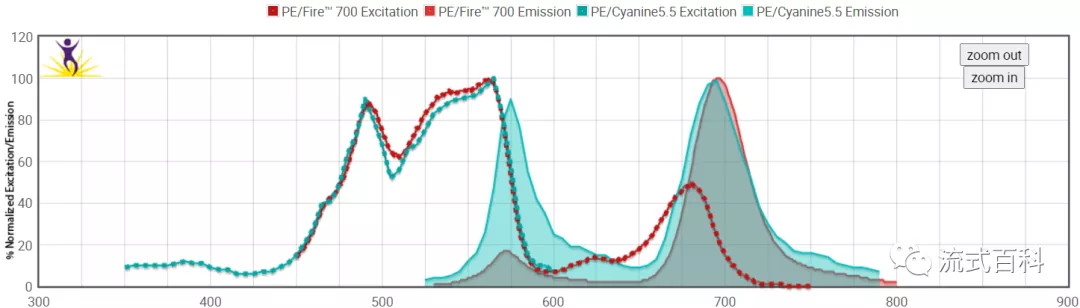 很顯然,在傳統(tǒng)的流式平臺(tái)PE/Fire? 700和PE/Cyanine5.5是不可以使用在同一個(gè)panel中的,但是在光譜流式中,兩種熒光染料由于其光譜特性存在一定的差異,是可以區(qū)分開(kāi):