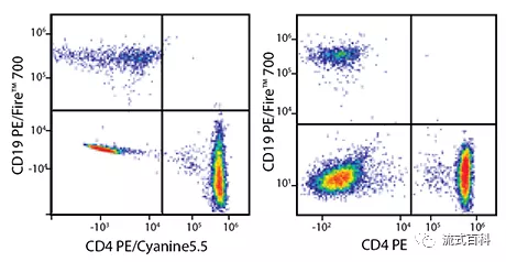 在5激光Cytek? Aurora 光譜流式平臺(tái)上,檢測(cè)人裂紅后外周血的CD4和CD19。PE/Fire? 700-CD19和PE/Cyanine5.5-CD4共染方案與PE/Fire? 700-CD19和PE-CD4共染方案得到了相似得陽(yáng)性信號(hào),說(shuō)明在光譜流式平臺(tái)PE/Fire? 700和PE/Cyanine5.5是有可能在一個(gè)panel中共用的,但是配色方案可以更加優(yōu)化。