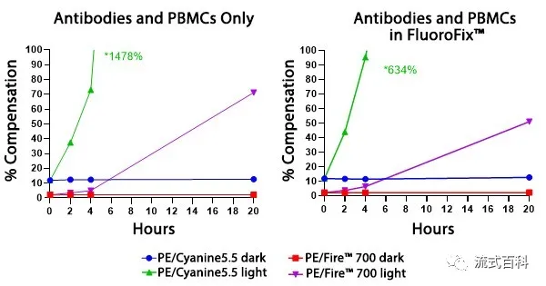 PE/Fire? 700 和PE/Cyanine5.5標(biāo)記的兩種CD4抗體檢測(cè)人PBMC,無(wú)論在避光條件下還是暴露在熒光的條件下,PE/Fire? 700的穩(wěn)定性要優(yōu)于PE/Cyanine5.5(檢測(cè)平臺(tái)為5激光Cytek? Aurora 光譜流式)。
