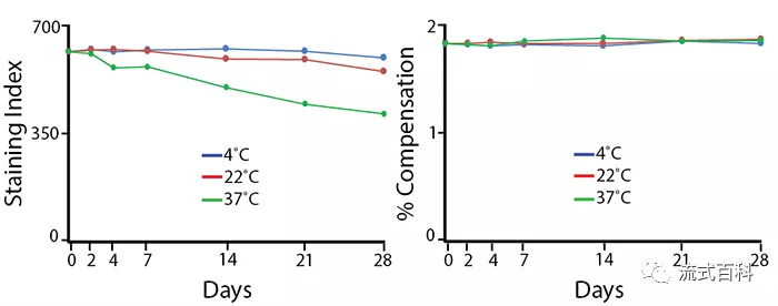 將PE/Fire? 700標(biāo)記的抗體分裝后分別保存在4℃、22℃和37℃下。穩(wěn)定性可以根據(jù)抗體的染色指數(shù)(staining index)和熒光補(bǔ)償百分比來(lái)衡量,隨著保存時(shí)間的延長(zhǎng),3種溫度保存條件下光補(bǔ)償百分?jǐn)?shù)并沒(méi)有發(fā)生改變,但是37℃的保存條件染色指數(shù)下降了約36%,22℃保存條件的染色指數(shù)下降了約12%,這主要是由于這兩種保存條件下抗體的非特異性染色背景升高引起的(檢測(cè)平臺(tái)為5激光Cytek? Aurora 光譜流式)。