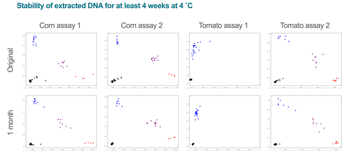 圖2. 用QuickExtract從玉米和番茄中提取的DNA用KASP基因分型技術(shù)進(jìn)行聚類(Original),然后在4℃下儲存1個月,再將樣品進(jìn)行聚類(1month) ,實驗結(jié)果完全一致。