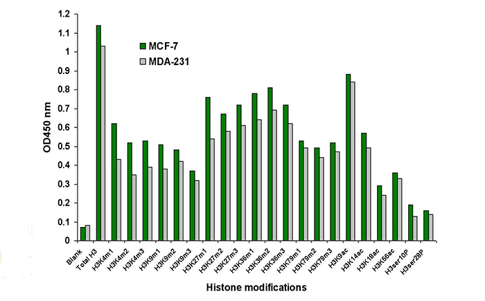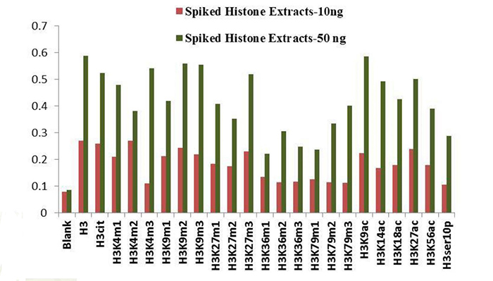 該試劑盒檢測(cè)H3修飾位點(diǎn):H3K4me1 、H3K4me2、H3K4me3、H3K9me1、H3K9me2 、H3K9me3、H3K27me1、H3K27me2、H3K27me3、H3K36me1、H3K36me2、H3K36me3、H3K79me1、H3K79me2、H3K79me3、H3K9ac、H3K14ac、H3K18ac、H3K27ac、H3K56ac、H3ser10P、H3cit、TotalH3