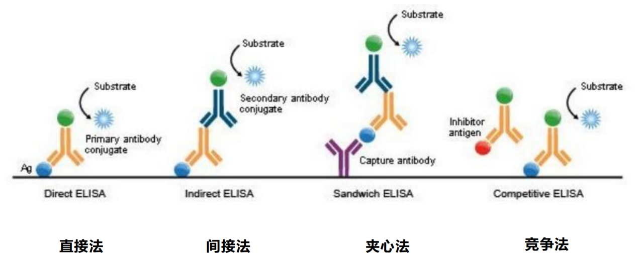 根據(jù)樣本及抗原抗體結(jié)合機(jī)制,可將ELISA分為四類:直接法、間接法、夾心法、競(jìng)爭(zhēng)法。