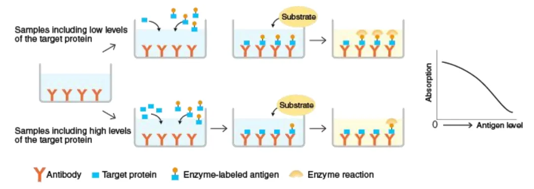 • 競(jìng)爭(zhēng)法:適合用于檢測(cè)小分子抗原,可分為直接競(jìng)爭(zhēng)法和間接競(jìng)爭(zhēng)法。直接競(jìng)爭(zhēng)法:將捕獲抗體固定于固相載體上,加入酶標(biāo)記抗原與待測(cè)樣本,若待測(cè)樣本中含有抗原,則會(huì)與酶標(biāo)記抗原競(jìng)爭(zhēng)結(jié)合載體上的捕獲抗體。間接競(jìng)爭(zhēng)法:將抗原固定于固相載體上,加入酶標(biāo)記抗體與待測(cè)樣本,若待測(cè)樣本中含有抗原,則會(huì)與載體上固定的捕獲抗原競(jìng)爭(zhēng)結(jié)合酶標(biāo)記抗體。