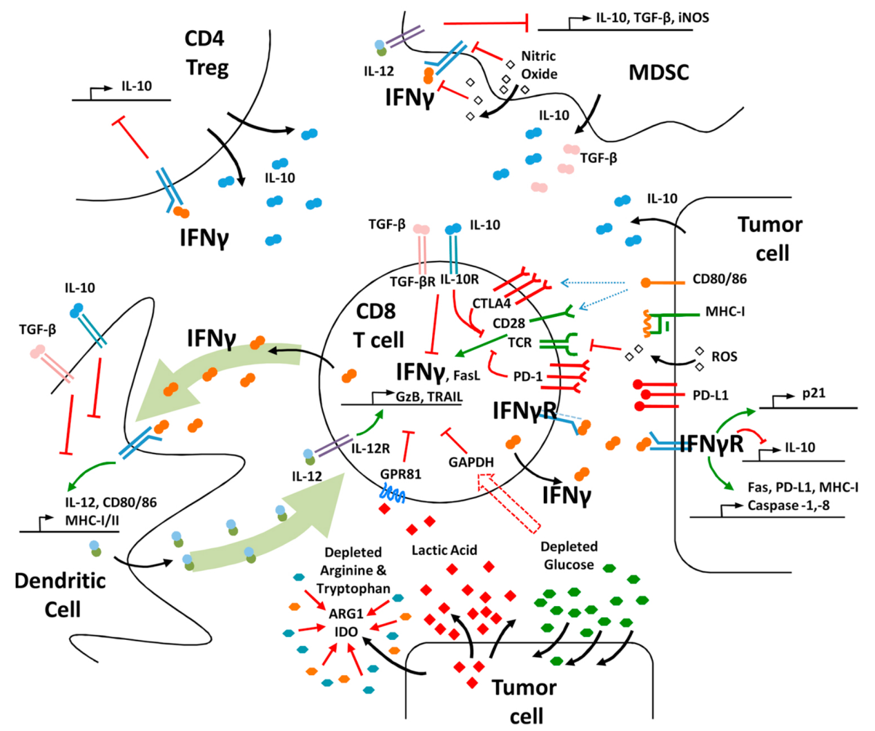 另一方面,與抗腫瘤作用相反,IFN-γ還發(fā)揮促腫瘤的作用。這種活性主要是由IFN-γ信號(hào)敏感性喪失、抗原呈遞減少以及IDO和檢查點(diǎn)抑制劑的誘導(dǎo)而產(chǎn)生。